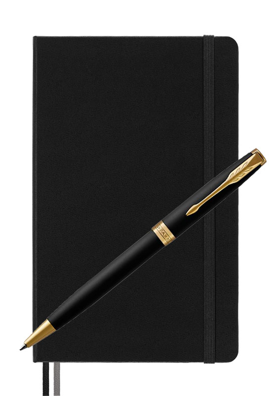Parker Sonnet Matte Black Gt Moleskine от официального дилера Parker в Краснодаре. Вы можете дополнительно заказать гравировку, которая подчеркнет Вашу оригинальность и придаст памятность статусному подарку. Все ручки Паркер поставляются в фирменном футляре.